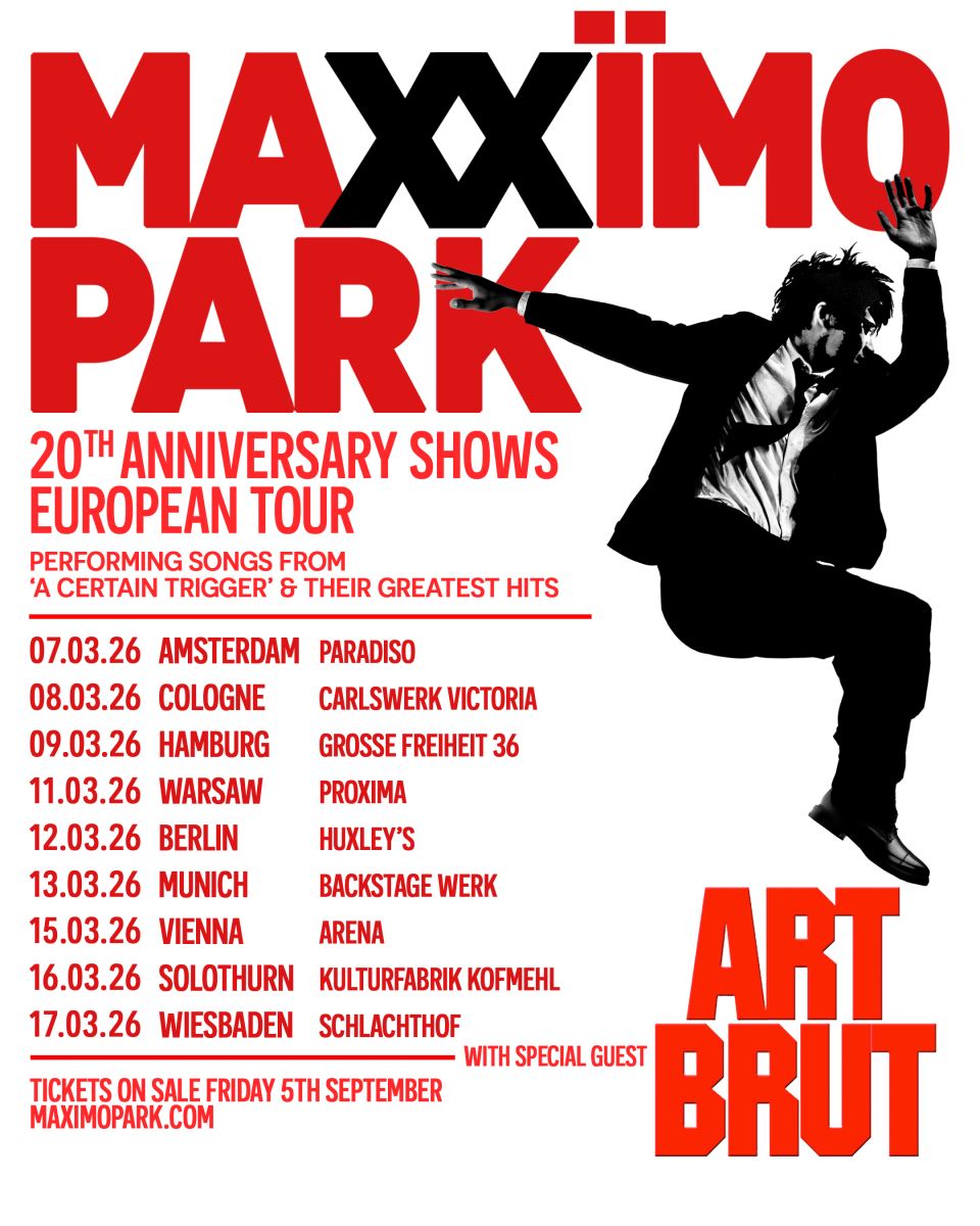It feels like only weeks ago we were letting you know the fine news that Art Brut, Top of the Pops, are touring with Maximo Park across the UK in February '26, It's not the first time that our bands have shared the stage. But it's DEFINITELY going to be the best time (for proof of this, please note that bis are also playing in Glasgow, Scotland. Awesome). Well, here we are again to tell you that we're all SUCH good chums, that we're going to play together in Europe as well, taking in such fine cities as Amsterdam, Cologne, Hamburg, Warsaw, Berlin, Munich, Vienna, Solothurn and Wiesbaden. To be honest. We absolutely can't bloody wait.